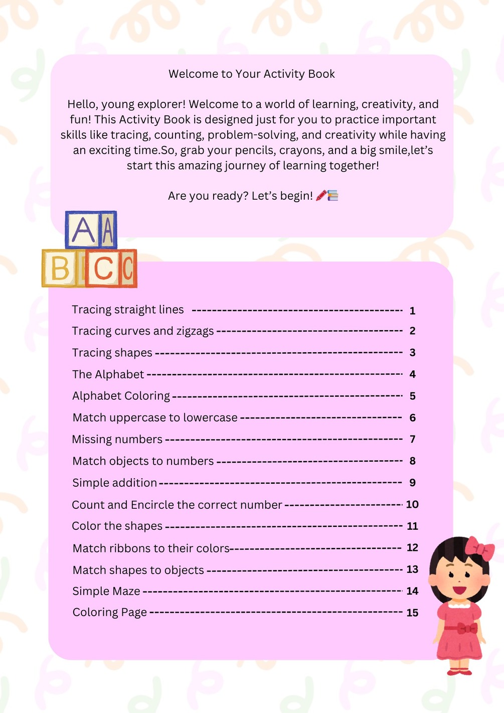 Make learning exciting with this interactive activity book designed to boost your child's creativity, problem-solving, and fine motor skills! From tracing lines and shapes to matching games, counting exercises, and coloring pages, this book is packed with engaging activities that make early learning fun.